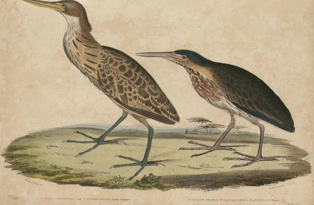 1. Cinnamon Heron, Ardea cinnamonea; 1. Yellow necked Heron, Ardea flavicollis